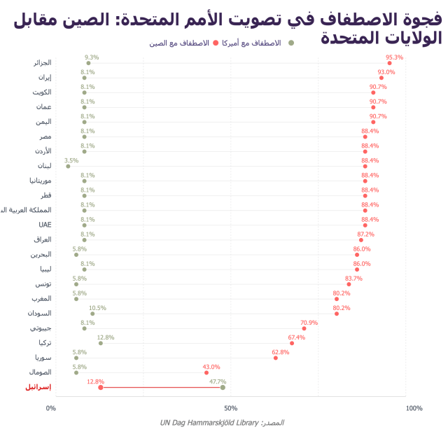 وعلى النقيض من المزاج الإقليمي، تُظهر بيانات «المرصد» أن الولايات المتحدة أكثر ميلًا للتصويت لصالح قرارات تُعدّ مؤيدة لإسرائيل، أو دفاعًا عن حقوق الإنسان، أو لفرض عقوبات تعاقب أطرافًا يُنظر إليها على أنها «سيئة السلوك».