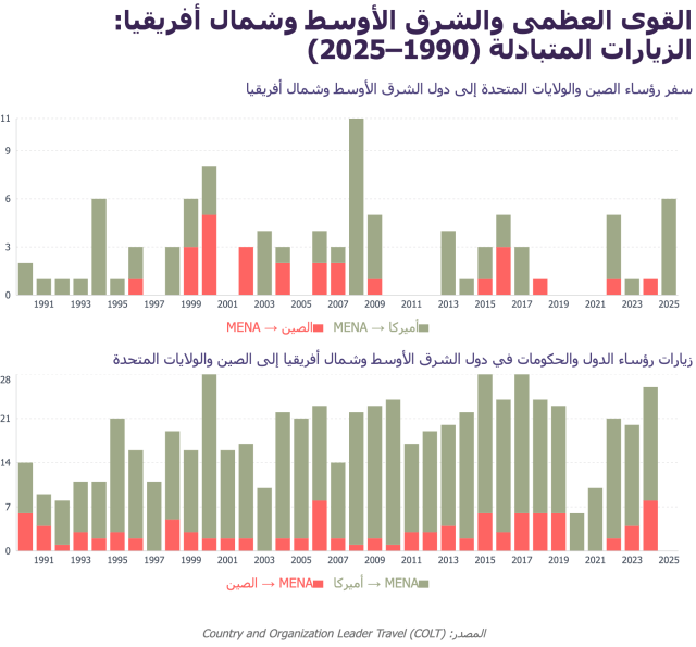 على مدى 35 عامًا، كان للرؤساء الأميركيين حضور أكثر وضوحًا في المنطقة، إذ زاروا دول الشرق الأوسط وشمال أفريقيا 69 مرة، مقابل 26 زيارة فقط لنظرائهم الصينيين. والعكس بالعكس صحيح: فقد زار قادة المنطقة الولايات المتحدة بوتيرة أعلى بكثير من زياراتهم إلى الصين—545 رحلة مقابل 106. (وتتأثر هذه الأرقام إلى حدّ ما بحقيقة أن أكثر من ثلث الزيارات إلى الولايات المتحدة كانت ضمن المشاركة في اجتماعات الأمم المتحدة في نيويورك).