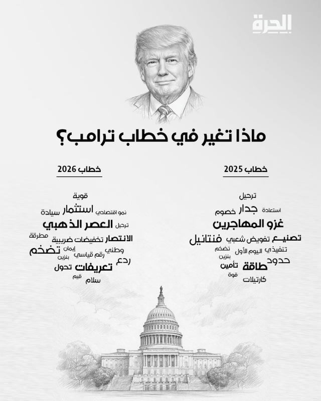 أما في “خطاب 2026″، فقد تحولت إلى “نتائج”، حيث حلت محلها مصطلحات مثل أرقام قياسية، تعرفات جمركية، نمو، وانتصار. لقد انتقل الخطاب من لغة “سنفعل” إلى لغة “لقد فعلنا”.